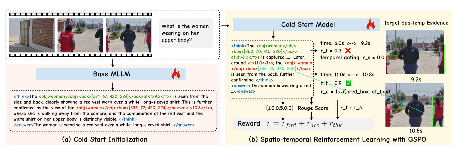 Stage 1: Cold-start initialization on STGR-CoT-30k equips the model with basic grounded reasoning.